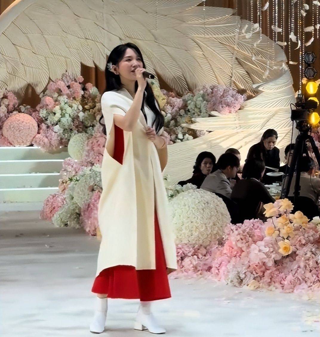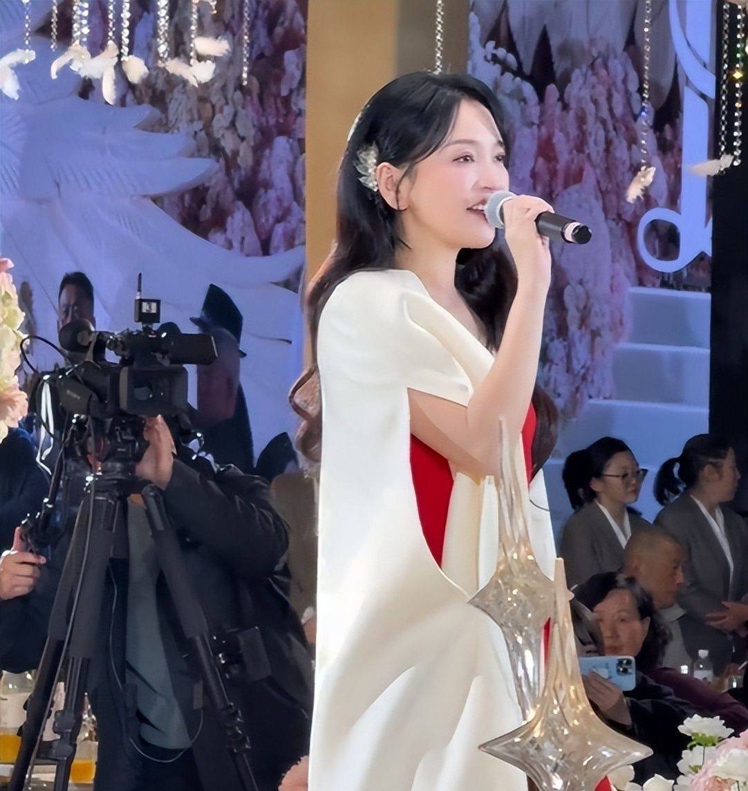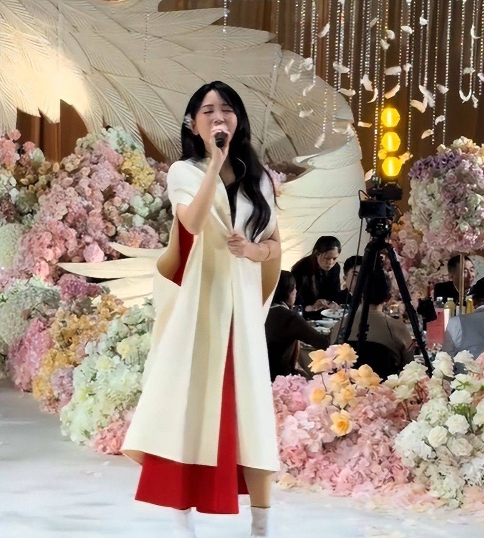 有现场网友拍下了这一幕:金莎受邀参加一场婚礼庆典,作为表演嘉宾登台献声。
